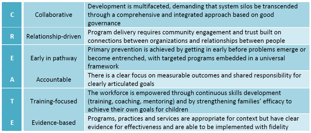 The CREATE model was developed toward the end of the Pathways to Prevention Project, in 2012. The model is a set of principles and an action methodology underpinned by good governance and community empowerment. CREATE is both an acronym and a framework that builds capacity for collective impact in communities by enhancing the ability of child-serving organisations to operate as part of an integrated system of care for children and families: http://www.creatingpathways.org.au/